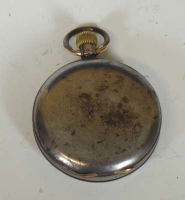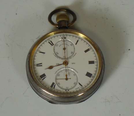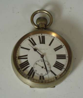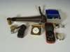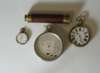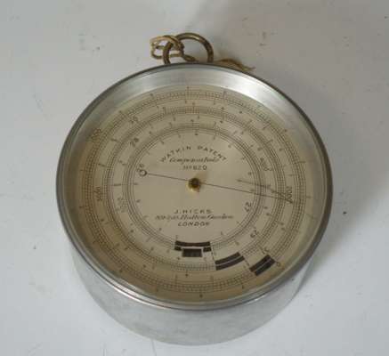 comprising: an aneroid barometer, by J. Hicks, London, silvered dial, 11.5cm diameter; a large white metal pocket clock, by Alex Clark, London, the white dial with black Roman numerals and subsidiary seconds dial with arabic numerals, 9cm diameter; a steel and brass pocket watch, by S. Smith & Son, London, the white dial with black Roman numerals and two subsidiary dials, 5cm diameter; a two draw mahogany and brass telescope, 42.5cm long extended; and various other miscellaneous items (qty)