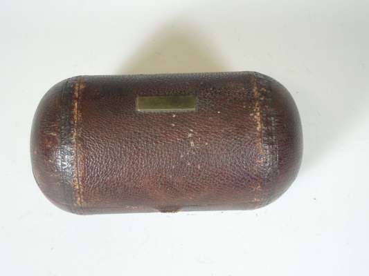 in a decoratively embossed leather cylindrical case, the twelve blade brass scarificator stamped with maker's name, and has its original decorative glaze, the case also houses a crystal glass bottle with removable stopper and a set of three graduated glass cups