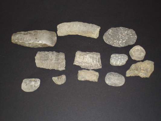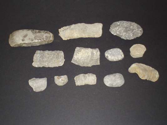 to include a polished grey flint handaxe, with a curved cutting edge, labeled 'Denmark', 15.5cm long; a caramel coloured handaxe, with a curved cutting edge tapering to a rounded butt, 8.5cm long; a mottled hand axe, polished toward the cutting edge, 12cm long; a cream flint handaxe, of trapezoidal form, labelled 'Denmark', 10cm long; a small cream flint chisel, 8.5cm long; a brown flint scraper, of semi-circular form, labeled 'Denmark', 12cm long; another smaller example, labeled 'Denmark', 7cm long; a dark brown flint handaxe, with a curved cutting edge, 9cm long; four other examples from Denmark and Sweden; and a collection of fossils (qty)