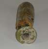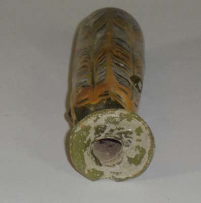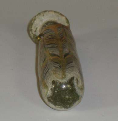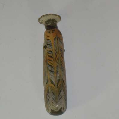 of green glass with disc rim, the tall cylindrical body with applied white and yellow feather combed trailing, with small lug handles, a rounded base (repaired)