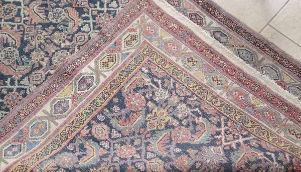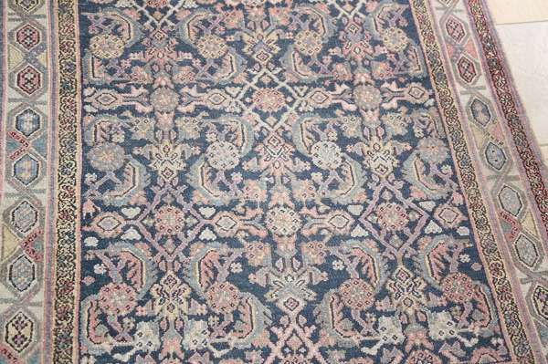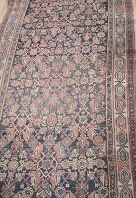 late 19th/early 20th century, the indigo field with allover herati pattern, within ivory stylised vine and elongated lozenge border between bands