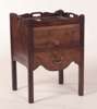 the shaped gallery with pierced handles, over a cupboard and single drawer with shaped apron enclosing a blue printed pot, raised on square legs with reeded corners