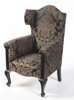 the arched top-rail over cushioned arms with foliated carved frieze panels raised on acanthus carved cabriole legs terminating in claw and ball feet, the whole covered in black and faded gold floral pattern upholstery