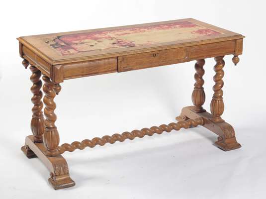 the moulded rectangular top with skiver, over a single frieze drawer and opposing dummy drawer, acorn finials, raised on spiraly turned legs, acanthus carved C-scroll feet united by stretchers PLEASE NOTE: THIS LOT HAS VAT ON THE HAMMER