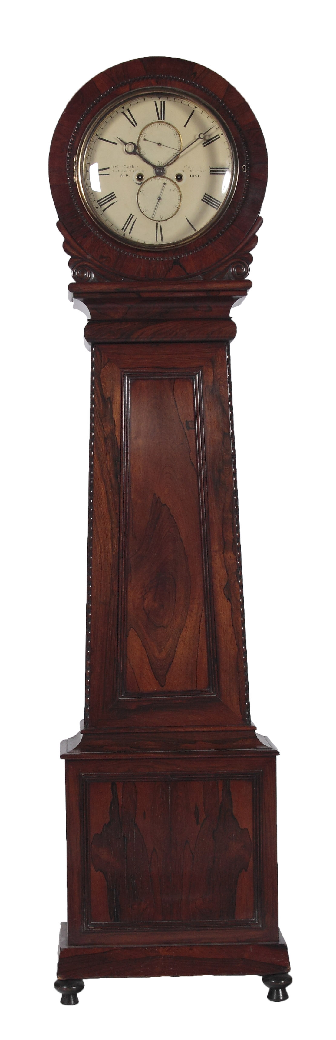 the white enameled dial with Roman numerals, signed 'Dobbie, Falkirk, A.D. 1842', subsidiary second and date dials, over a tapering paneled trunk door, the moulded paneled base raised on turned feet