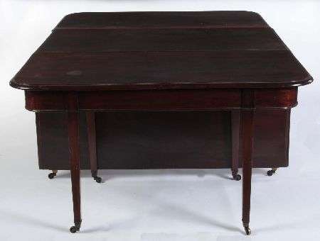 the rounded rectangular top comprising a drop leaf centre section and two D-end sections, the plain frieze with reeded lip edge, on square tapering legs, ending in brass socket castors PLEASE NOTE: THIS LOT HAS VAT ON THE HAMMER