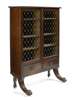 the top with moulded edge above two brass trellis doors enclosing adjustable shelves and a pair of frieze drawers, on associated front facing sabre legs with carved paw feet, turned rear legs