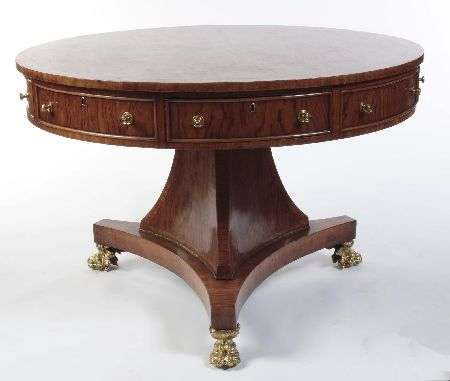 the circular top above four frieze drawers flanked by simulated drawer fronts with brass pull handles, on a gilt metal framed spreading triform pedestal and platform base with winged lion paw feet
