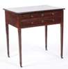 the boxwood strung moulded top over two cockbeaded long drawers raised on dot-and-line inlaid square legs terminating in brass caps and castors