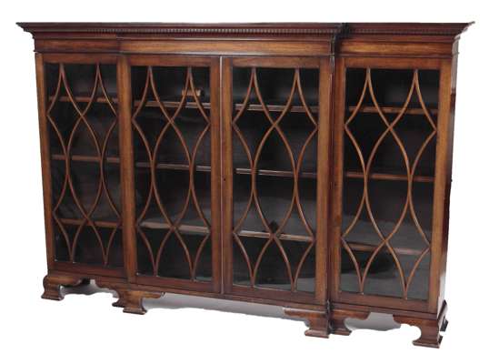 the projected moulded dentil cornice over four astragal glazed doors enclosing shelves, raised on ogee bracket feet
