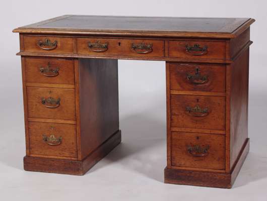 An early 20th century small oak twin pedestal desk