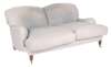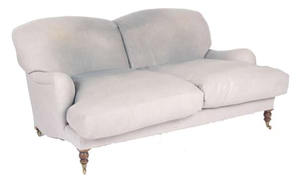 the double arched cushioned back over deep loose cushioned seat raised on squat baluster turned legs terminating in brass caps and castors