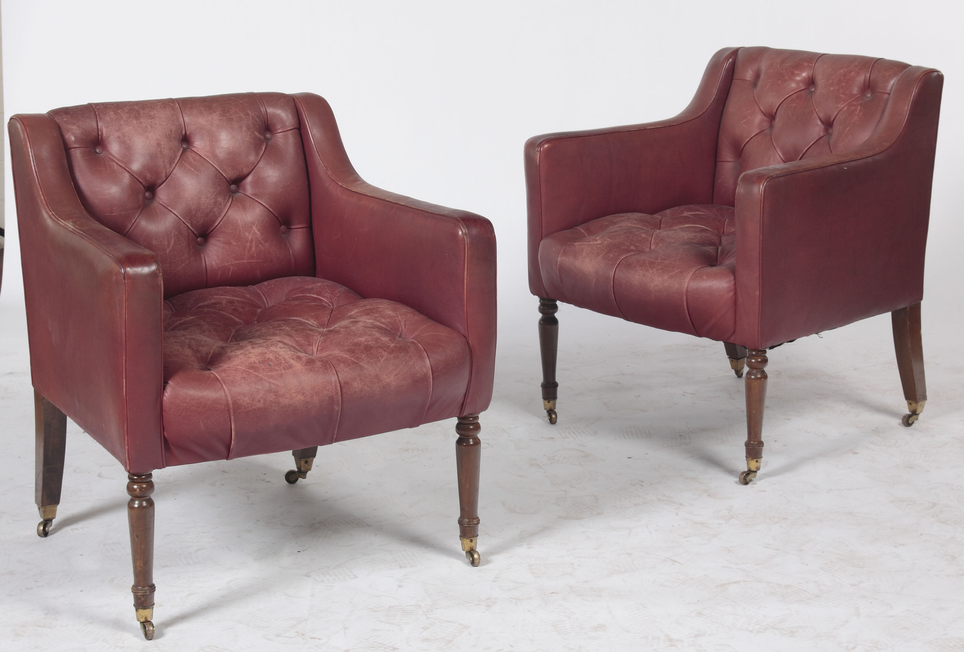 each with cushioned arms over buttoned cushioned seat raised on tapering baluster turned legs terminating in brass caps and castors (2) PLEASE NOTE: THIS LOT HAS VAT ON THE HAMMER