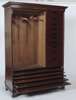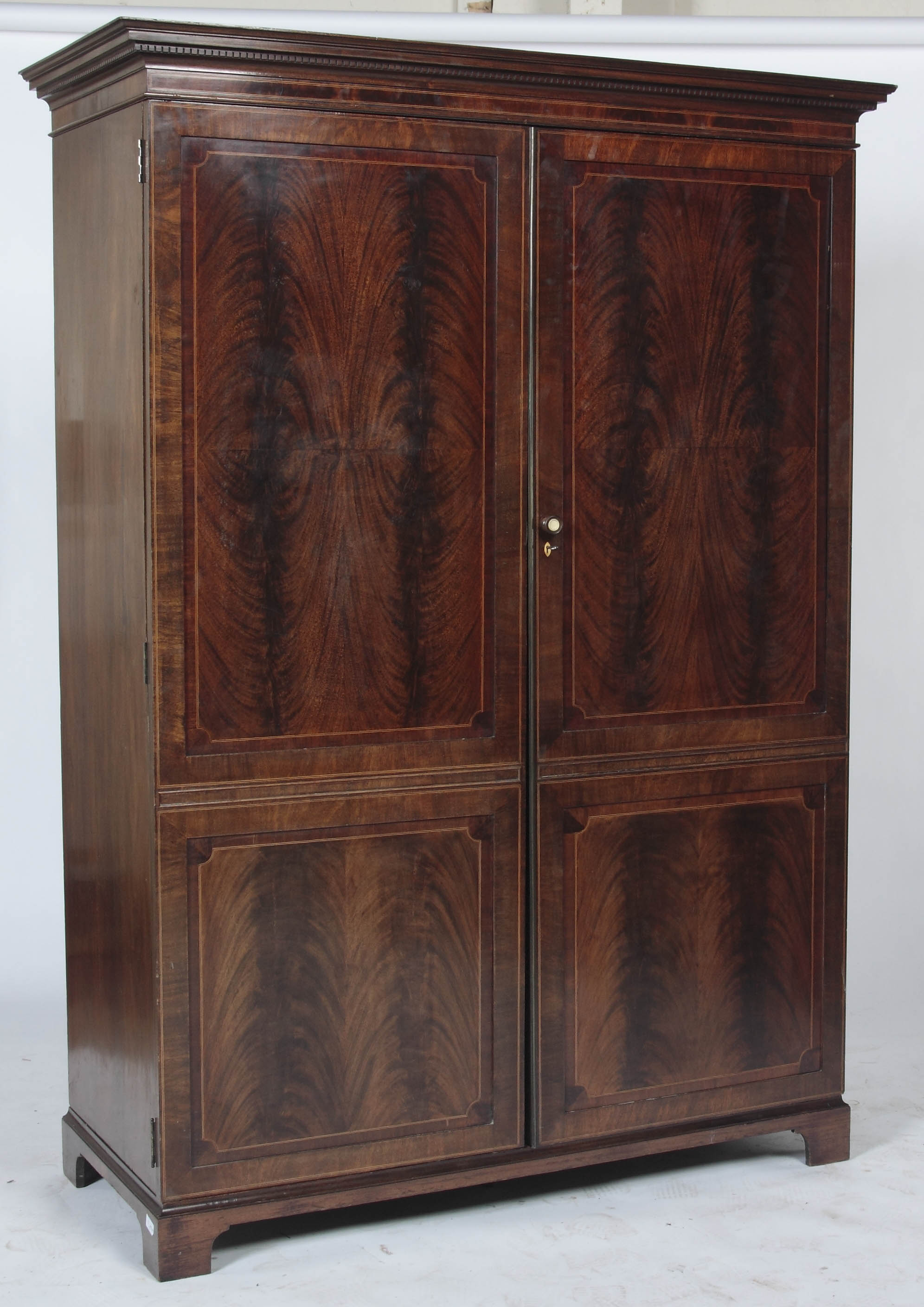 the projected moulded dentil cornice over a boxwood strung frieze panel above two panelled doors enclosing full length mirror, hanging space, drawers and linen slides, raised on bracket feet