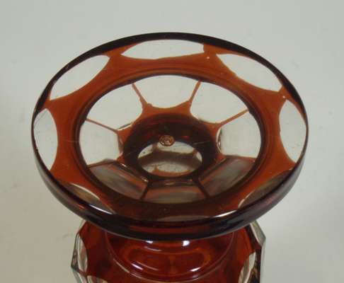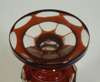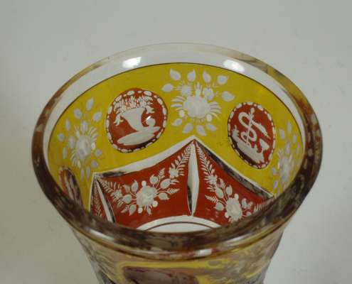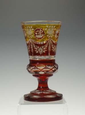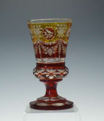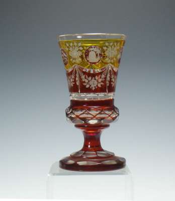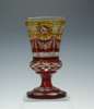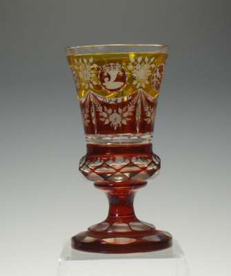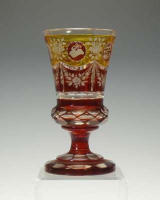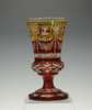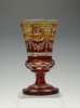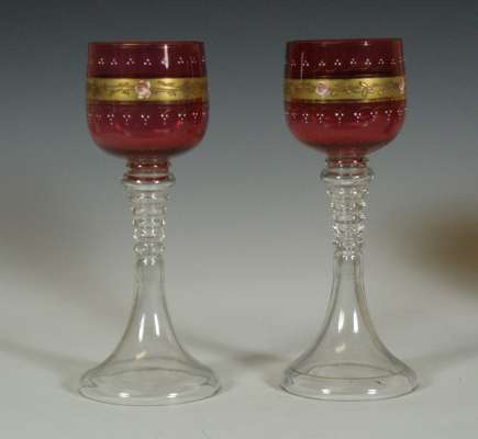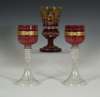 with etched floral and classical scenes, 16cm high; and a pair of tall glasses, each with cranberry bowl and gilt border, clear knopped stem and conical foot, 19.5cm high (3)
