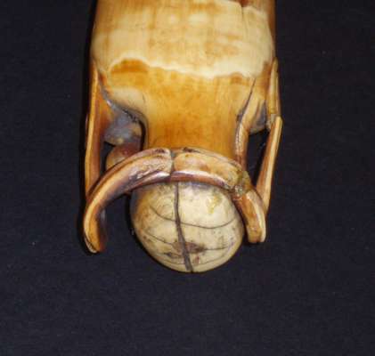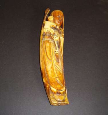 holding a young male child on her right arm and holding prayer beads in her left hand