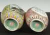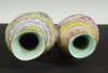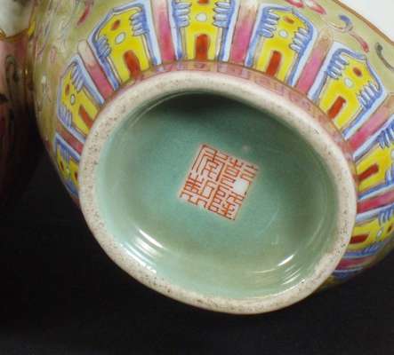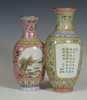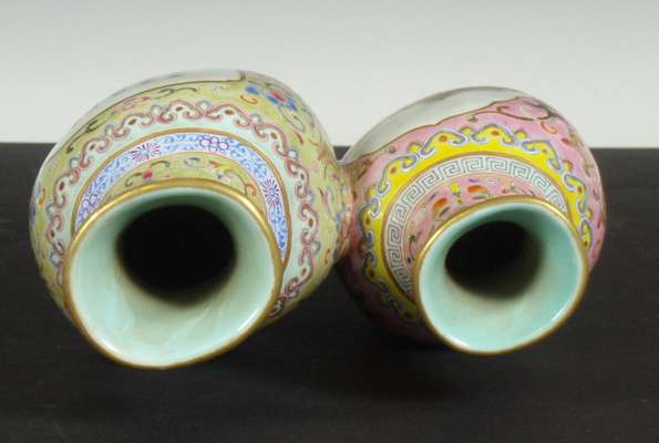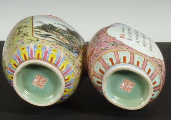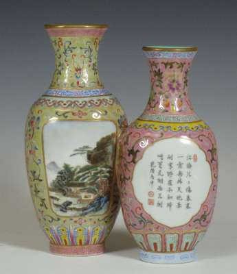each vase decorated with opposing panels of summer or winter and character marks, surrounded by either a pink or yellow ground decorated with orchids and character marks, red broken Qianlong seal mark