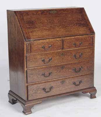 the moulded fall-flap enclosing fitted interior over two short and three long drawers, raised on ogee bracket feet