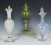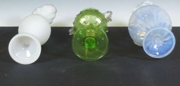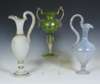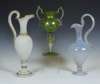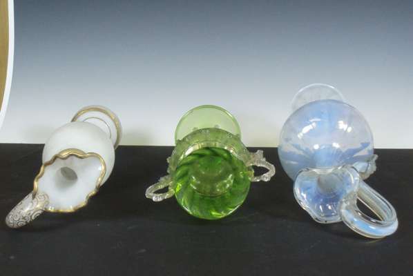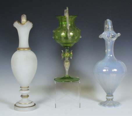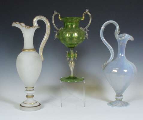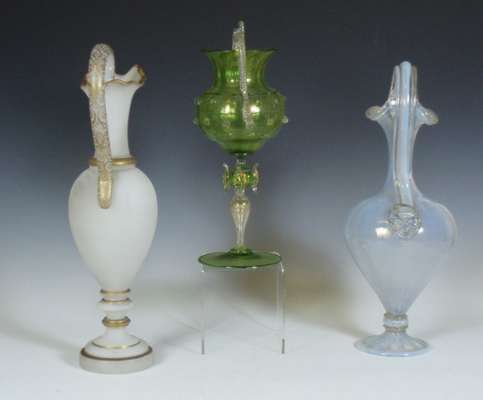 of tall slender form with trefoil rim, 34cm high; a Bohemian frosted glass ewer of tall slender form with shaped rim and gilt highlights, 36cm high; and a later Venetian green and aventurine glass vase with twin handles, 28cm high (3)