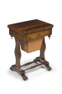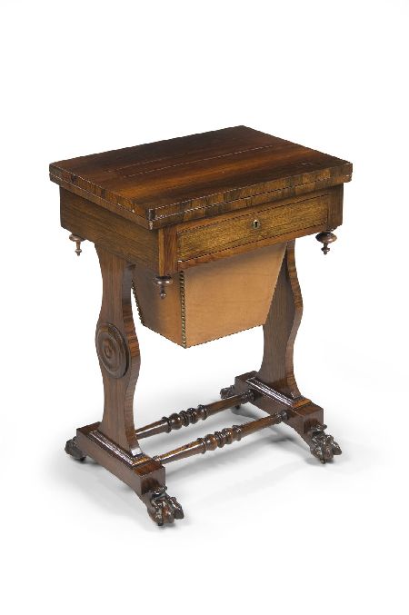 the rectangular hinged top opening to reveal a chess board, above a single frieze drawer and basket below, the corners with pendant turned finials, on shaped end supports and carved feet united by dual turned stretchers