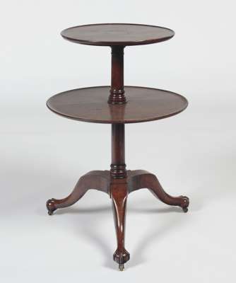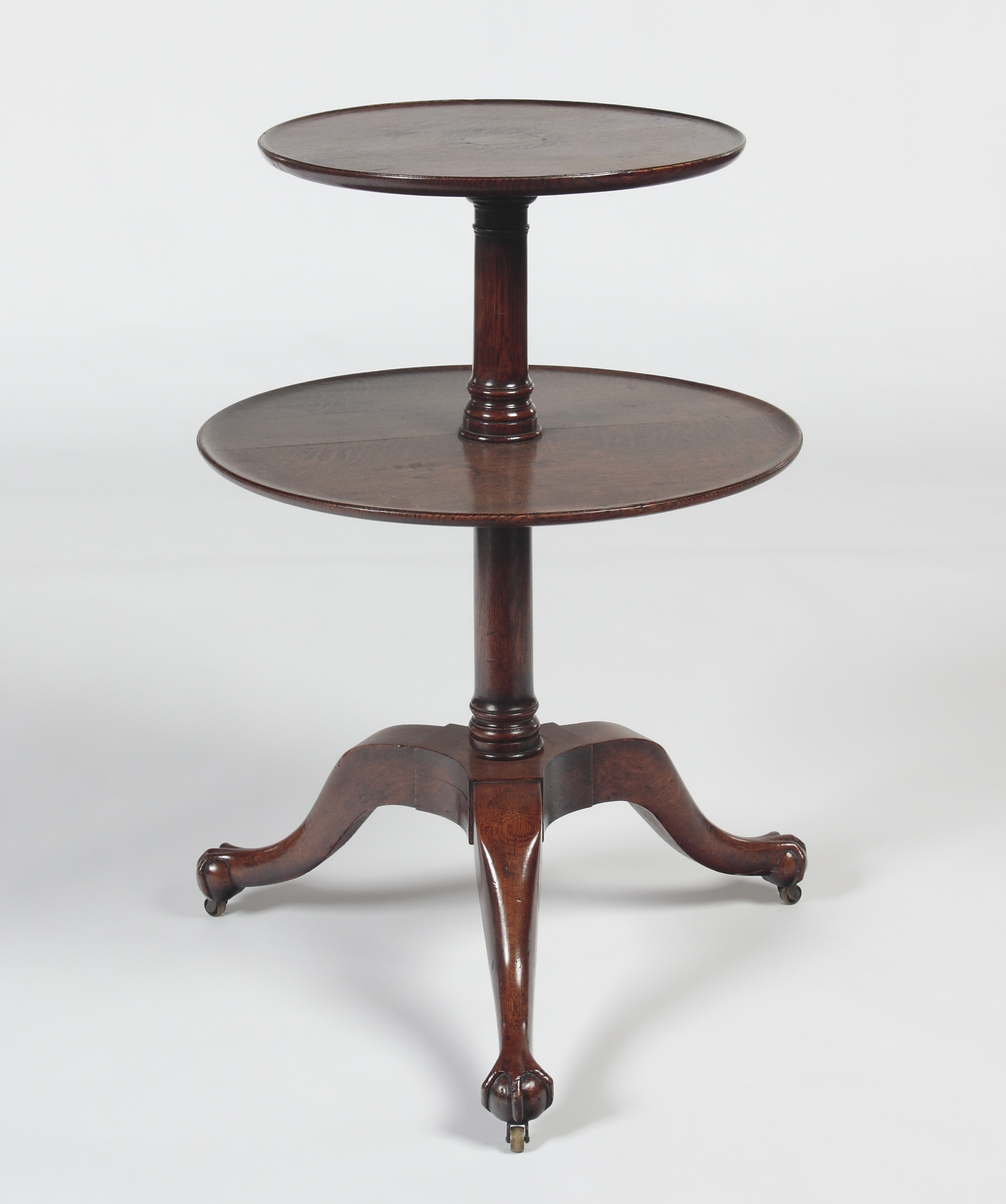 the the two graduated circular shelves raised on a baluster turned column, cabriole tripod legs terminating in claw and ball feet