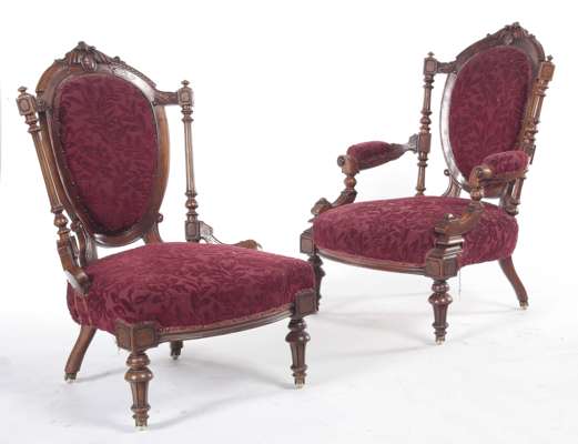 each with elaborate cartouche carved top rail and frame over a red cushioned oval back flanked by fluted columns, serpentine cushioned seat, raised on squat fluted baluster turned legs terminating in ceramic castors (2)