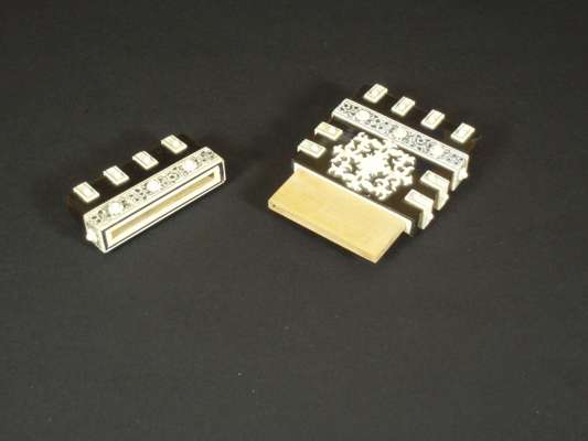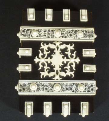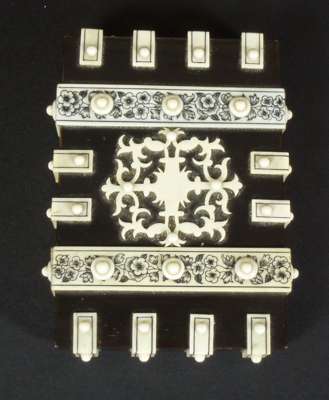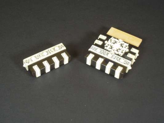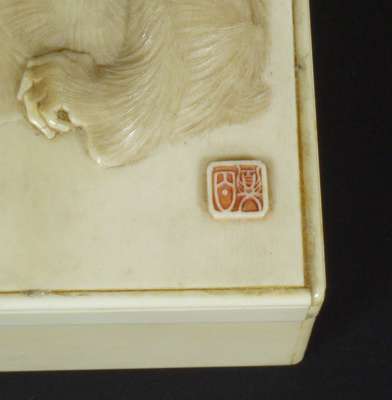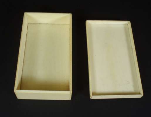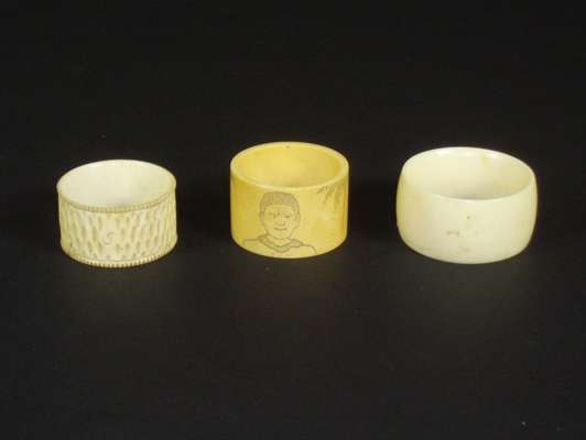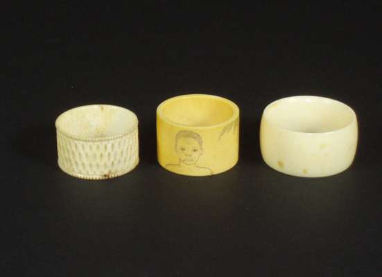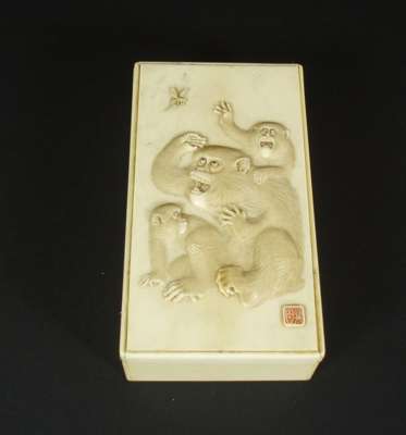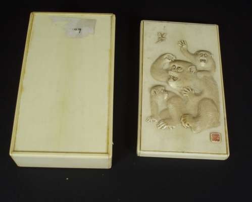 with engraved foliate design, 11cm long, 8cm wide; an Eastern ivory box decorated with monkeys in relief, character marks, 16.5cm long, 9cm wide; and three ivory engraved knapkin rings of assorted shapes and sizes (5)