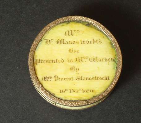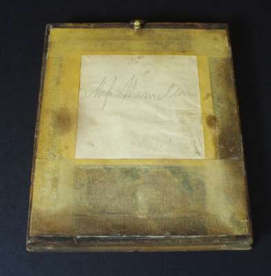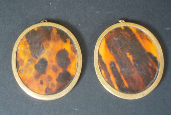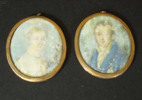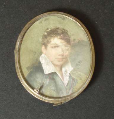 in a wood frame with gilt lining, 9.5cm x 7cm; a pair of portrait miniatures of a gentleman and a lady, each a watercolour on ivory, in yellow metal and tortoiseshell frames, 5.5cm x 4.8cm (damages); another portrait miniature of a boy, watercolour on ivory, 5.7cm x 4.8cm (damages); and a tortoiseshell and ivory circular box bound in yellow metal with inscription, 4.5cm wide (lacking cover) (5)