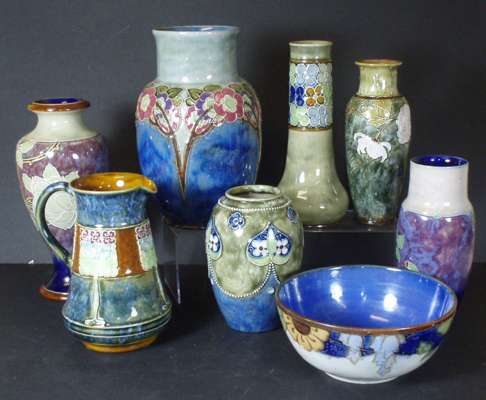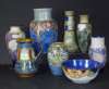 each decorated with stylized plant forms, impressed marks, comprising: a baluster vase, 28cm high; an ovoid vase, 27.5cm high; an ovoid vase, 23cm high; an ovoid vase, 21cm high, an ovoid vase, 19cm high; a tall ovoid vase, 25cm high; a jug 20cm high; a bowl 21cm wide (8) PLEASE NOTE: THIS LOT HAS 5% IMPORT TAX ON THE HAMMER