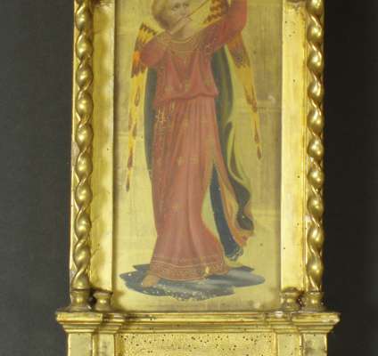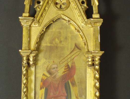 A 19th century Renaissance Revival painted panel of a trumpeting angel