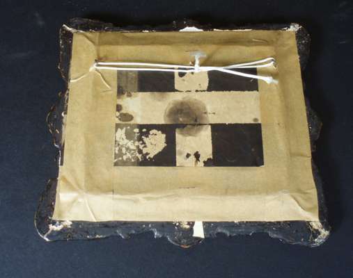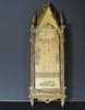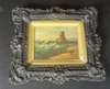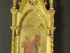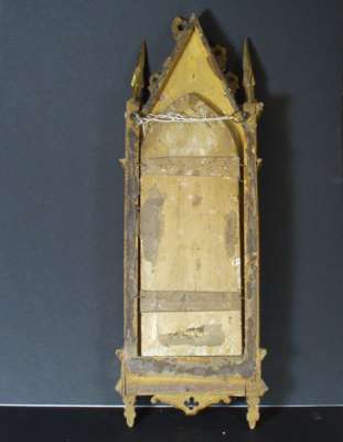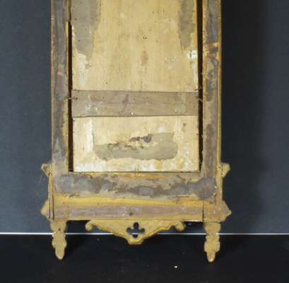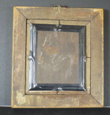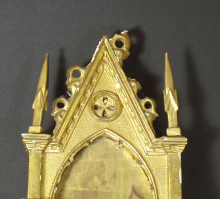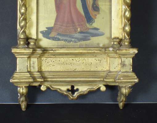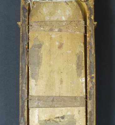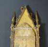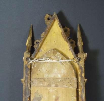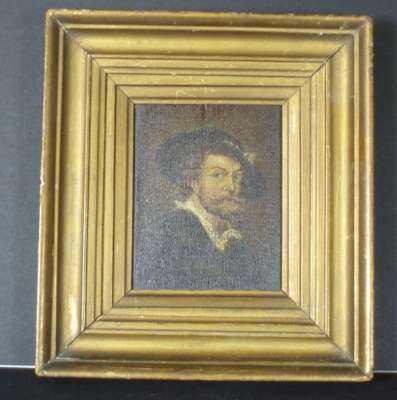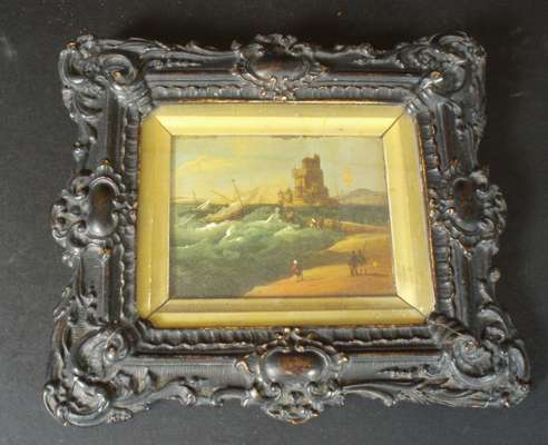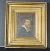 on a gilt ground, arched and in an architectural style giltwood frame, overall 67cm x 23cm; a small painting of a shore scene with a castle, figures and ships in a choppy sea, 7cm x 9cm; and a small oil on panel of a half portrait of a bearded gentleman wearing a hat, 13cm x 10.5cm (3)