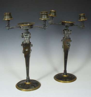 the two branches with scroll supports, the stem modelled as a bearded man's head on tapering plain column with pan pipes and cymbals to the sides, all raised on a shallow circular base with lady's faces with flowing hair