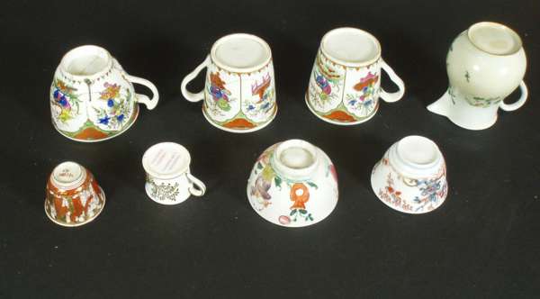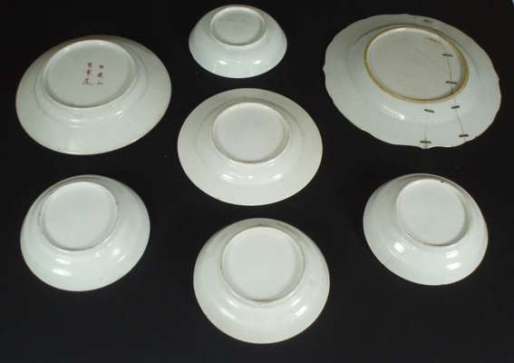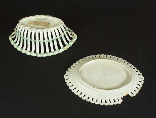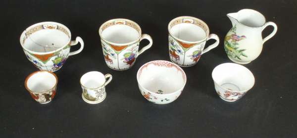 comprising: three bowls and cups and a plate decorated with the Worcester factory 'Dragons in Compartments' pattern, unmarked; a Chamberlain's Worcester miniature tankard with a painted scene of Worcester Cathedral, printed mark; a sparrow beak jug; a creamware reticulated basket and underplate, probably Leeds; and six Chinese and Japanese wares (damages) (17)