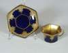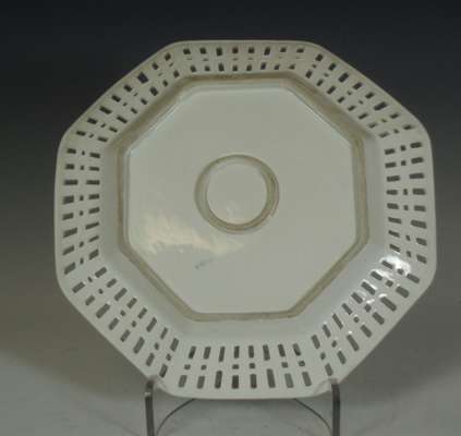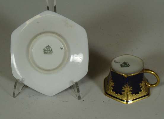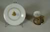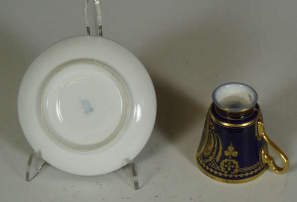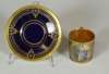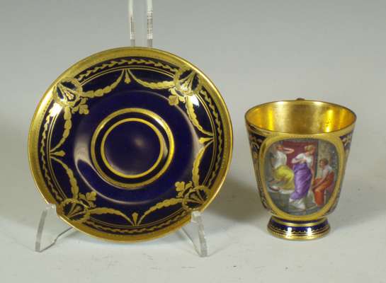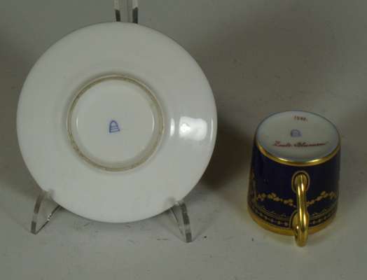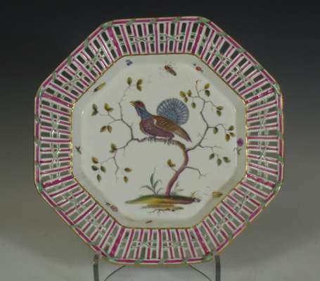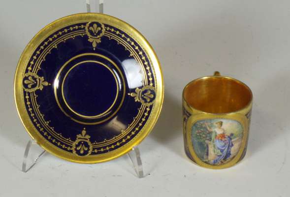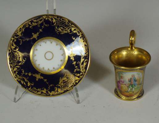 of a mother and child at a dressing table, impressed marks '2790/51/70', cancelled blue painted cross sword marks, 19cm high; a Continental octagonal porcelain plate of a pheasant on a branch with puce and green reticulated border, blue painted mark, 28cm wide; and four coffee cans and saucers, three with painted panels on a cobalt blue and gilt ground, painted and printed marks (10)