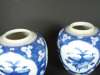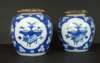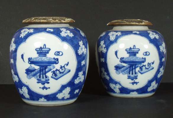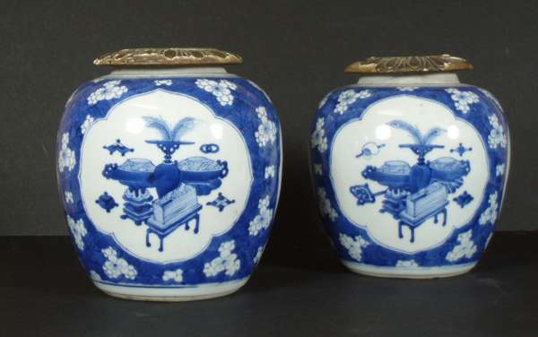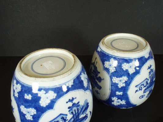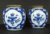 each of ovoid form, opposing reserves decorated with interior scenes and surrounded by a floral ground, double blue concentric circles to base, wooden covers