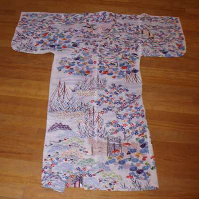 in the chayatsuji technique of dyeing, embroidered with gilt and silk thread with garden scenes in river landscapes