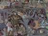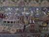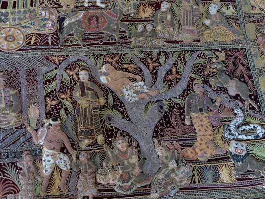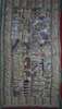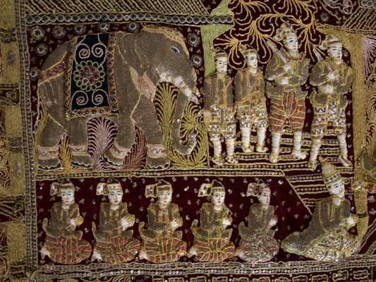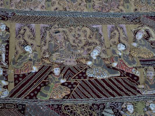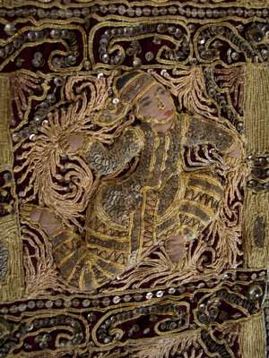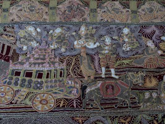 with embroidered threads, sequins and gemstones, the centre depicting two rows of raised work figures in a procession, with an elephant, horse drawn carriage, a figure in a tree and various animals, with a border of dancing male figures