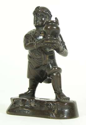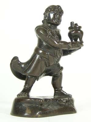 standing on a plinth presenting a vessel, 13cm high; and a Chinese bronze figure of a foreigner attendant, Ming dynasty or later, standing with an incense burner held aloft, his robe blowing behind him, 13cm high (2)