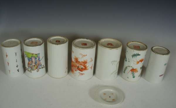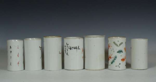 A group of seven 19th century Chinese porcelain famille rose brush pots