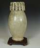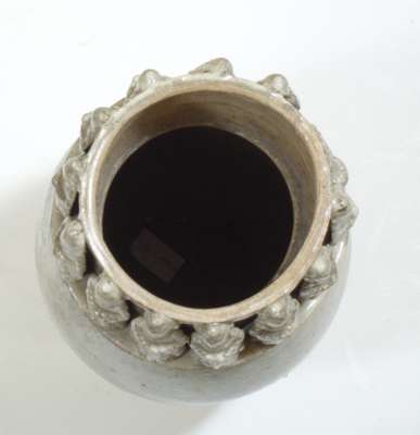 of ovoid form with a border of figures in relief around the neck, cream white slip, with wood stand