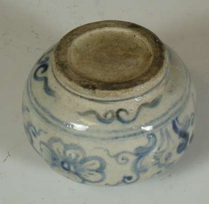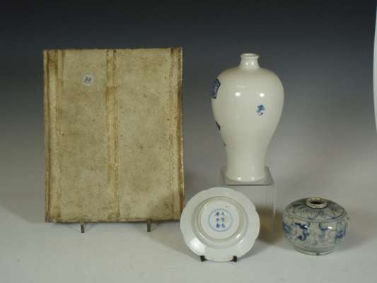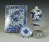 decorated with dragons chasing a pearl of wisdom, framed by fruit and foliage, 25.5cm x 20.5cm; a Chinese blue painted slim baluster vase decorated with two figures on a bridge, 19cm high; a small shaped circular Chinese dish with quatrefoil cloud medallion and stylised foliage, 10.8cm diameter; and a South East Asian blue painted vase decorated with flowerheads and foliage, 7.5cm high (4)