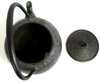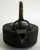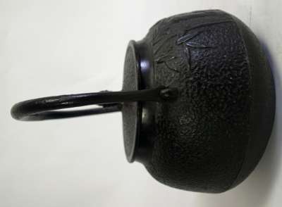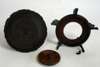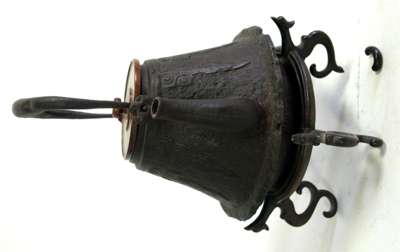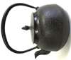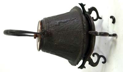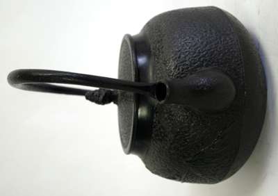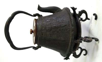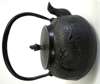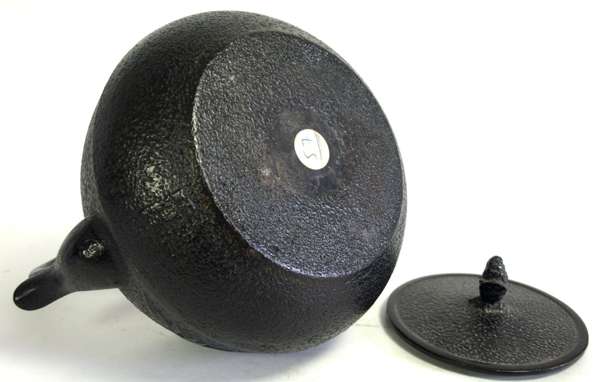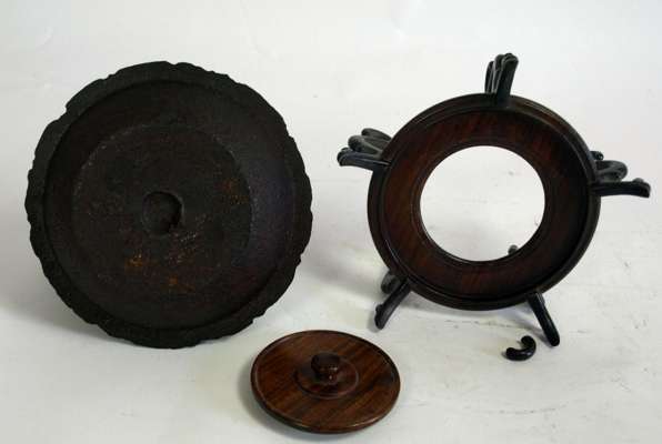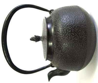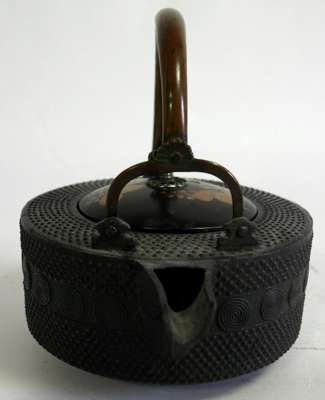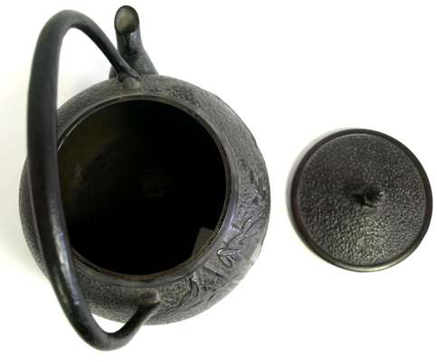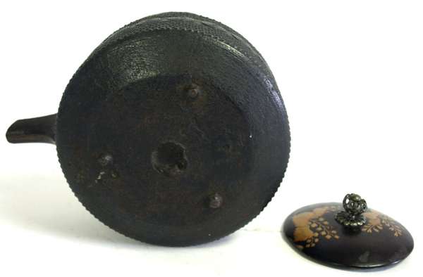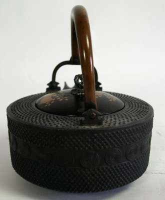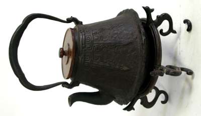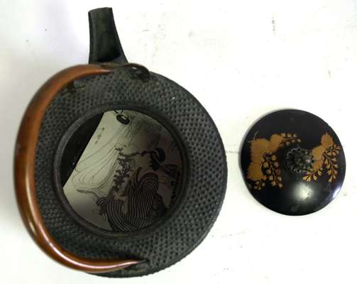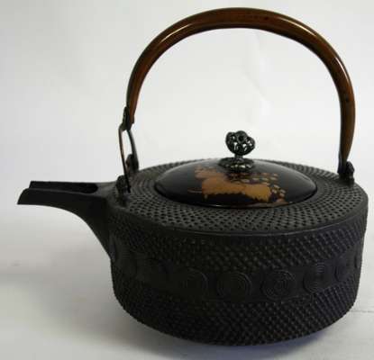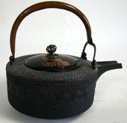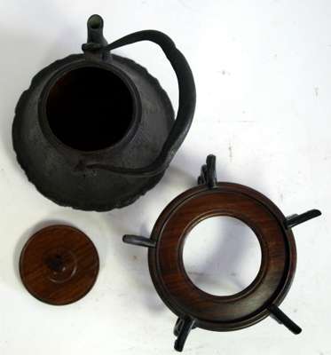 with relief decoration of bamboo, 22cm; together with another Japanese iron tetsubin, of conical form with archaic style leaves pointing down from the rim, wood stand and cover, 18.5cm high; together with another Japanese iron tetsubin for sake, with a later lacquer lid painted with gilt leaves, the outside decorated by a band of swirls and bead work, 16.5cm high (3)