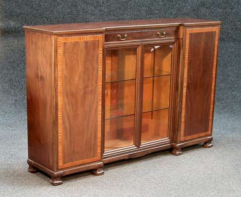 the moulded crossbanded top over two short drawers, two glazed doors enclosing glass adjustable shelves, flanked by crossbanded doors raised on bracket feet