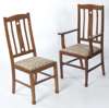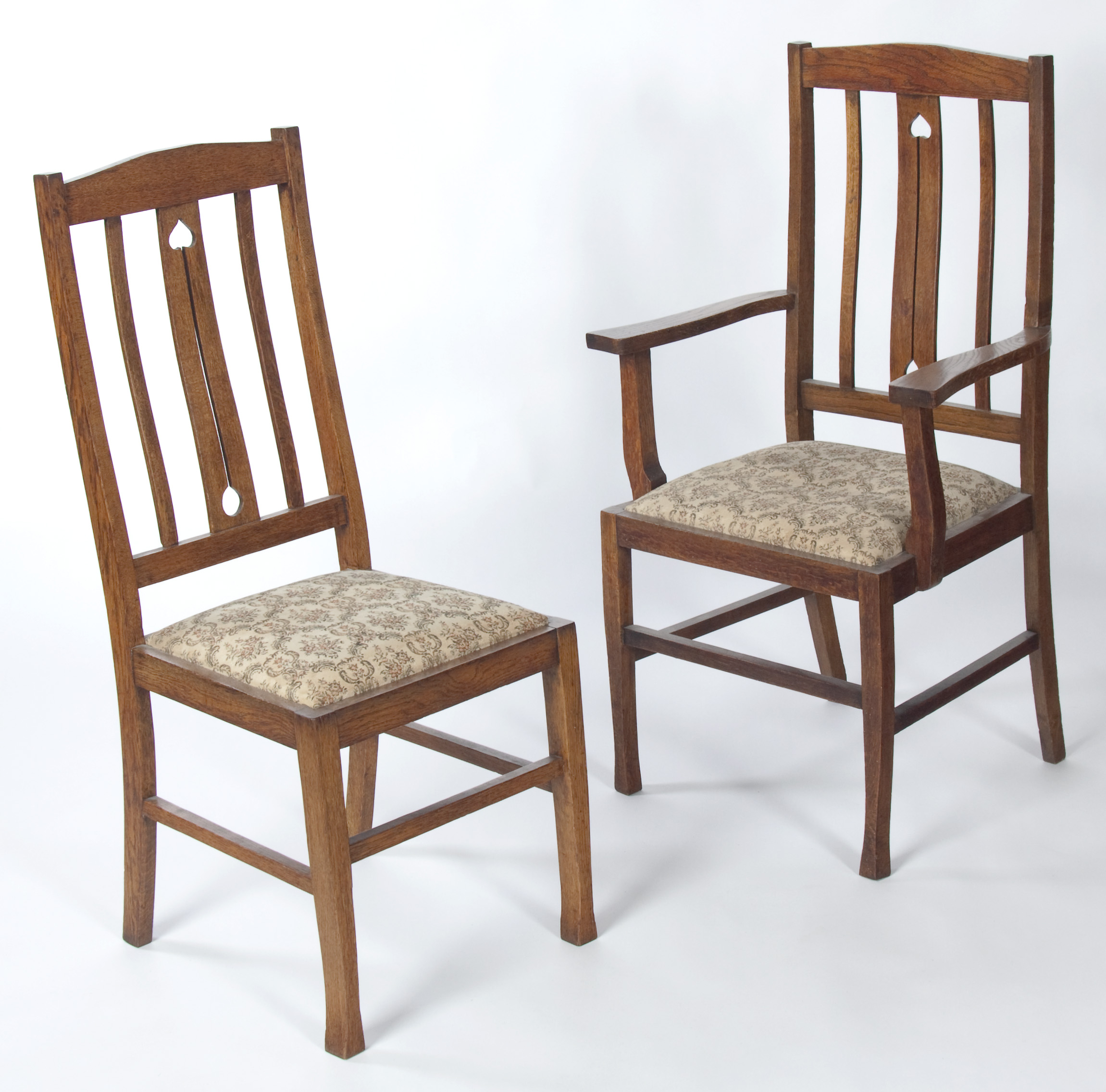 each with arched top-rail, over vertical splats, drop-in pad seat, raised on square legs united by stretchers; including a carver, (6)