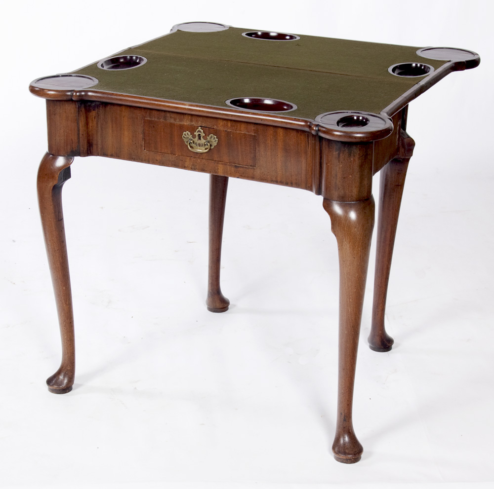 the rectangular top with lobed corners, enclosing wells and baize lining over a short frieze drawer, raised on cabriole legs terminating in pad feet