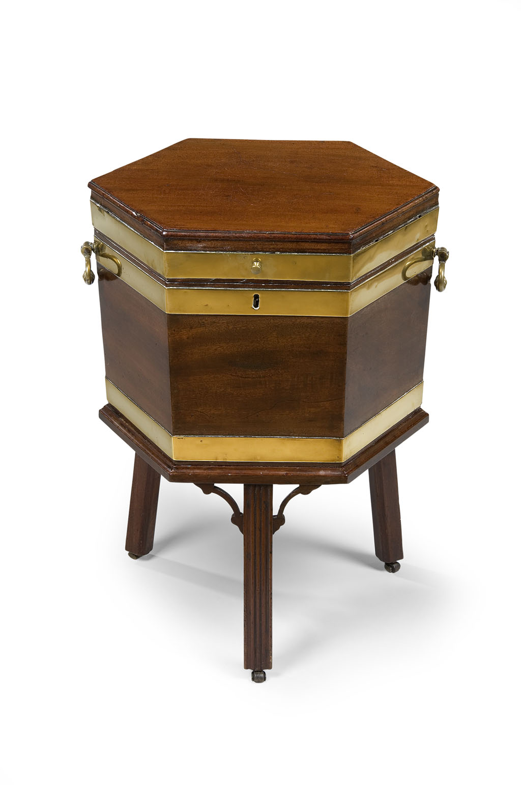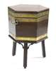 of hexagonal form with moulded top and brass carrying handles, enclosing a metal liner, on stand with three reeded legs