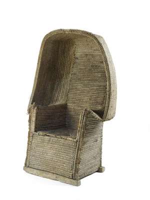 of arched and hooded basket weave design with out-spread enclosed arms and drop-in seat revealing commode aperture, on a box seat with wooden trestle feet