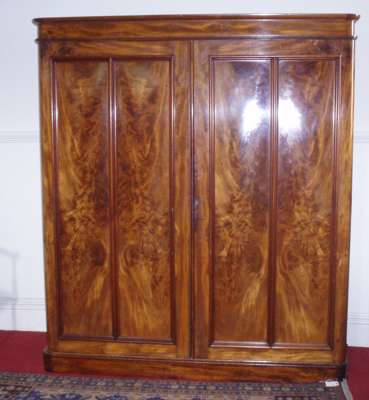 the projected moulded cornice over two panelled doors enclosing hanging space and a combination of drawers, raised on plinth base