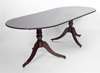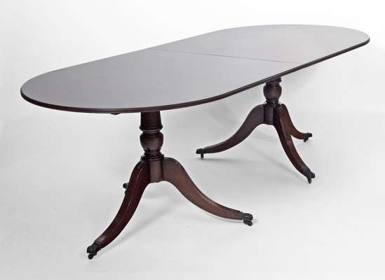 the brass inlaid crossbanded reeded top raised on baluster turned columns and sabre legs terminating in brass caps and castors; including two additional leaves