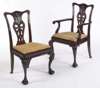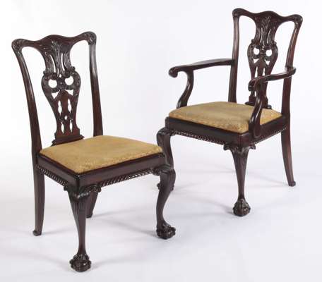 the leaf-carved backs with pierced vase splats above drop-in seats with gadrooned rails, on carved cabriole legs ending in claw and ball feet (8)